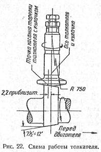 Благодаря сфере на рабочей поверхности тарелки толкателя, а также небольшому конусу по ширине кулачков (см. ниже „Распределительный вал") точка касания тарелки толкателя с кулачком несколько смещена относительно оси вращения толкателя. Это смещение способствует вращению толкателей во время работы, чем достигается равномерный износ их стержней и тарелок (рис, 22).
