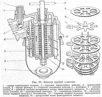 При прохождении масла через фильтрующий элемент, на наружной поверхности его, а также в промежутках между фильтрующими пластинами остается значительная часть крупных частиц грязи и смолистых веществ, имеющихся в масле.
