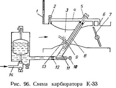 заслонки, через задроссельное 6 или через оба выходные каналы в виде эмульсии поступает в задроссельную полость. Эта эмульсия подхватывается воздухом, идущим по главному воздушному каналу, смешивается с ним и в виде горючей смеси поступает В цилиндр двигателя.По мере открытия дроссельной заслонки в диффузоре возрастает разрежение и в работу вступает главное дозирующее устройство. В этом случае топливо из топливного колодца 11 через распылитель 13 поступает в воздушный поток, идущий через диффузор 3. Здесь топливо воздухом распыляется, перемешивается с ним и в виде горючей смеси поступает в цилиндр двигателя. В это же время из преддиффузорной полости по трубке через жиклер 9, а также через систему холостого хода по каналу 4 и трубке 8 поступает воздух. Этот воздух затормаживает рост разрежения в топливном колодце и эмульсирует топливо.