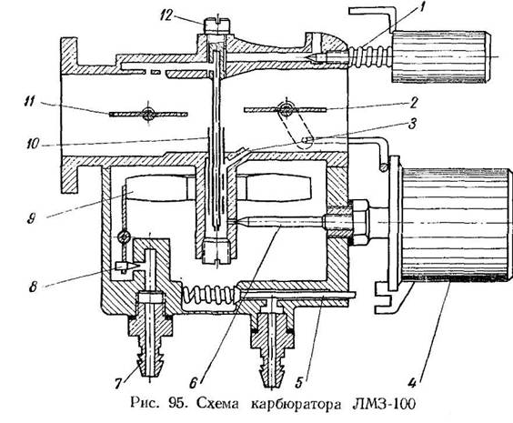 Карбюратор ЛМЗ-ШО имеет главную дозирующую систему и систему холостого хода.Главная дозирующая система состоит из главного топливного жиклера, сечение которого с помощью колпачка 4 регулируется конической иглой 6, воздушного жиклера 3 и трубки-распылителя 10.