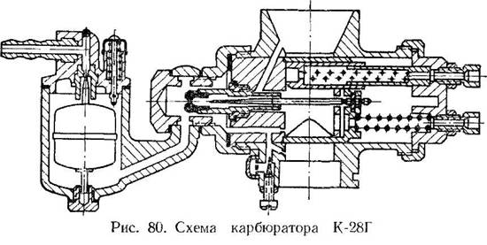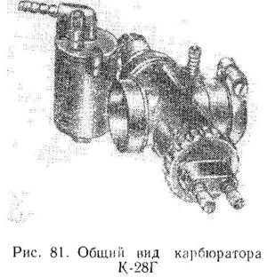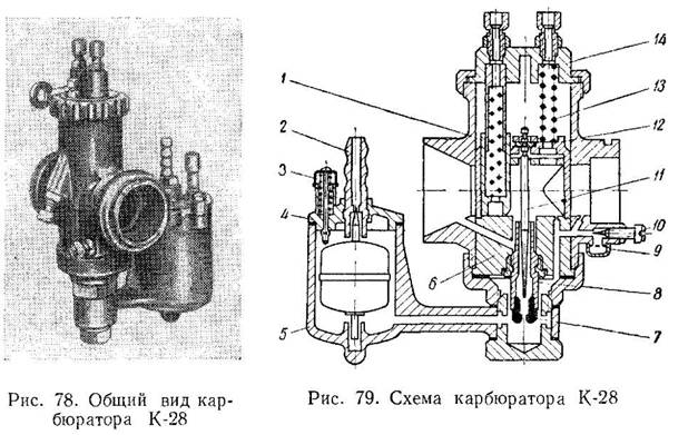 Все модификации карбюратора золотникового типа горизонтальные. У карбюратора К-28Г в отличие от других модификаций дроссельный золотник имеет горизонтальный ход.Корректировка состава горючей смеси осуществляется цосредством профилированной дозирующей иглы и регулированием разрежения в распылителе главной системы. В карбюраторе К-28 предусмотрены самостоятельная система холостого хода и воздушная заслонка для обогащения горючей смеси. На рис. 78 дан общий вид, а на рис. 79 представлена схема карбюратора.