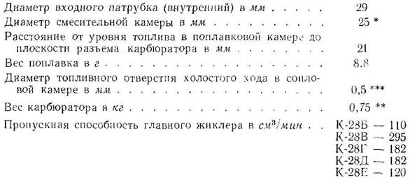 Основные данные карбюраторов К-28 (К-28Б, К-28В, К-28Г, К-28Д, К-28Е) следующие: