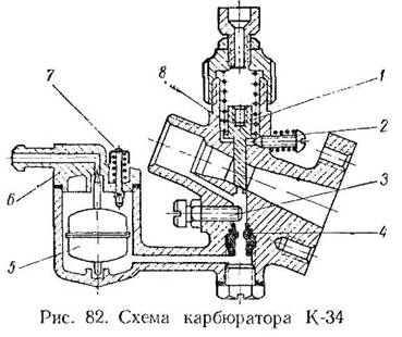 Карбюратор К-34 — с наклонным воздушным каналом и дроссельной заслонкой шиберного типа. Корректировка состава горючей смеси осуществляется методом изменения разрежения в канале главного жиклера. Схема карбюратора дана на рис. 82.