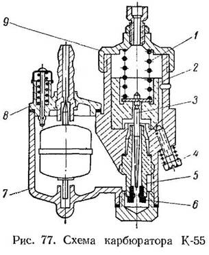 Карбюраторы — горизонтальные золотникового типа. Корректировка состава горючей смеси осуществляется посредством профилированной дозирующей иглы. На рис. 77 представлена схема карбюратора К-55. Корпус 7 карбюратора выполнен из цинкового сплава за одно целое с поплавковой камерой.