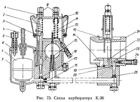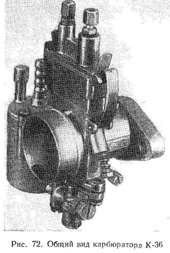 Модификации карбюратора различаются между собой конструкцией топливоприемных штуцеров в крышке поплавковой камеры и присоединительных патрубков для крепления на двигателе, а также диаметрами диффузоров и смесительных камер, наличием или отсутствием топливного корректора и регулировкой дозирующих элементов.Карбюратор К-36, общий вид которого представлен на рис. 72, а схема на рис. 73, однокамерный, горизонтальный, с небалансированной поплавковой камерой и плоским П-образным дроссельным золотником.