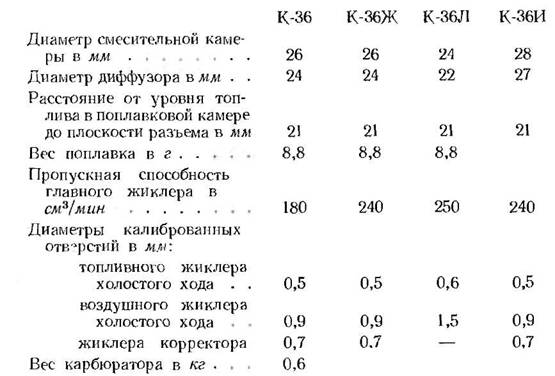 Для обеспечения нормальной обкатки мотоцикла на крышке смесительной камеры 1 с внутренней стороны устанавливается штифт, ограничивающий открытие (подъем) дроссельного золотника. После обкатки штифт убирают.Основные данные карбюраторов К-36, К-36Ж, К-36Л и К-36И следующие: