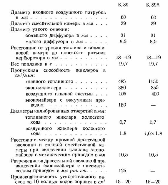 Карбюраторы К-89 и К-89А двухкамерные, с одновременным открытием дроссельных заслонок, с падающим потоком горючей смеси и двойным распыливанием топлива. Карбюраторы предназначены для V-образных двигателей ЗИЛ. В настоящее время карбюратор К-89А устанавливается на двигатель автомобиля Урал-375. Устройство и работа карбюраторов К-89 и К-89А тождественны устройству и работе карбюраторов К-88 и К-88А и отличаются от последних лишь размерностью.Основные данные карбюраторов К-89 и К-89А следующие: