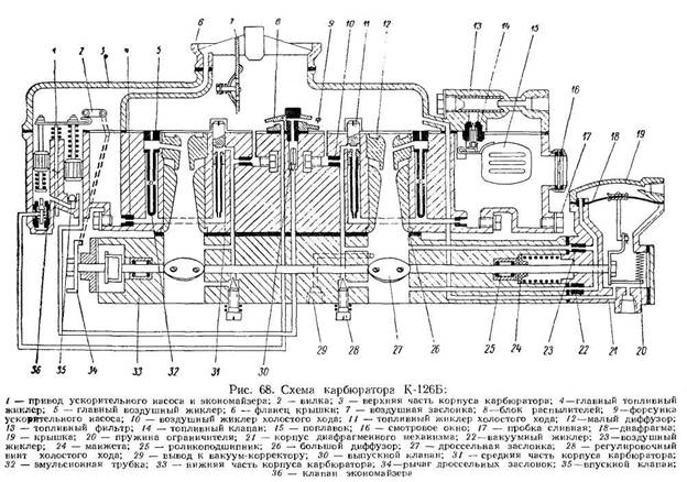 Система холостого хода карбюратора К-126Б совершенно аналогична таковой карбюратора К-126, т. е. состоит из топливных жиклеров-трубочек, размещенных вертикально в колодце, и воздушных жиклеров, размещенных горизонтально под пробками.Система ускорительного насоса и экономайзера размещена в центре поплавковой камеры между правой и левой камерами карбюратора.
