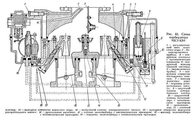 Поплавковая камера (одна) обслуживает обе камеры.Карбюратор МКЗ-К84 имеет два последовательно включенных экономайзера с механическим и пневматическим приводами, которые являются общими для обеих камер.