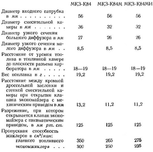 Основные данные карбюраторов МКЗ-К84, МКЗ-К84М и МКЗ-К84МИ следующие: