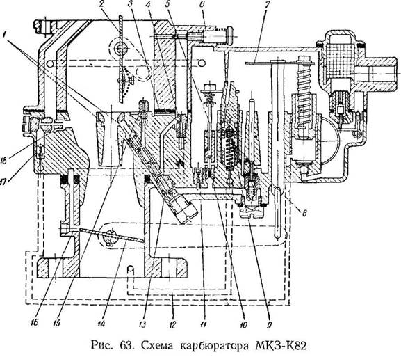 Для предотвращения подсоса топлива из форсунки ускорительного насоса при работе двигателя с постоянным положением дроссельной заслонки в форсунке 18 имеется радиальное отверстие.В дальнейшем карбюратор модернизирован и получил индекс К-82М.