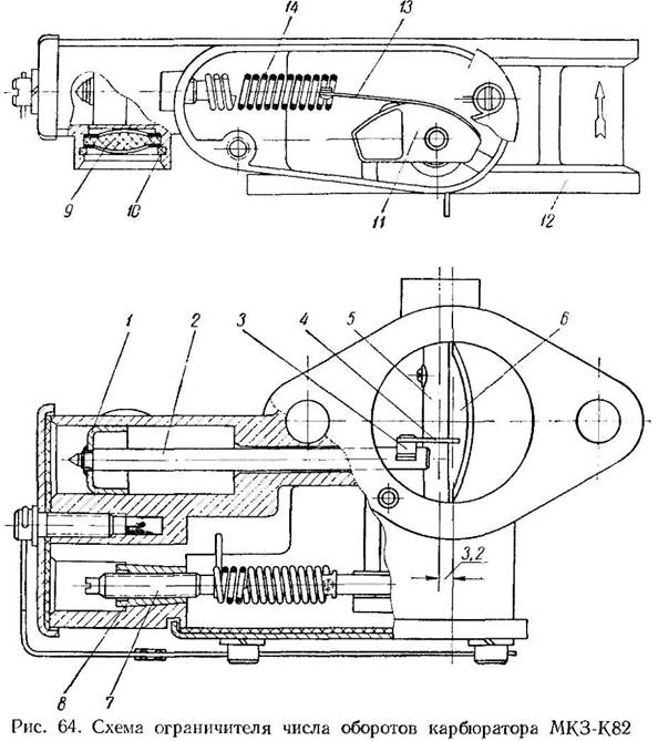 На оси заслонки плотно сидит профилированный кулачок 77, на котором закреплена ленточная тяга 13, соединяющая кулачок с пружиной ограничителя 14. Пружина ограничителя имеет две регулировки: грубую и тонкую. Грубая регулировка осуществляется изменением числа рабочих витков пружины с помощью винта 7, а тонкая — ее натяжением с помощью гайки 8.В конструкции ограничителя предусмотрено специальное стабилизирующее устройство, предотвращающее открытие заслонки