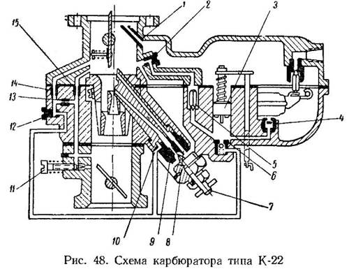 Карбюраторы типа К-22 однокамерные с тройным распыливанием и падающим потоком горючей смеси. Корректировка состава горючей смеси осуществляется методом изменения разрежения в диффузорах в сочетании с работой дополнительного жиклера.