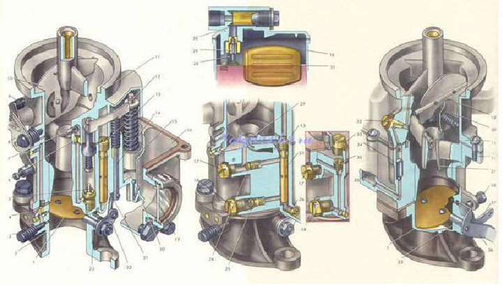 В корпусе поплавковой камеры 16 расположены большой диффузор и малый диффузор 27, главный топливный 26 и главный воздушный 24 жиклеры, эмульсионная трубка 21, топливный 25 и воздушный жиклеры системы холостого хода, клапан 5 системы экономайзера и система ускорительного насоса.