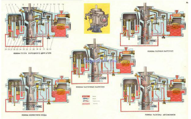 Для обеспечения необходимого протекания процессов в двигателе на всех режимах работы карбюратор имеет следующие дозирующие системы: систему пуска холодного двигателя, систему холостого хода, главную дозирующую систему, систему ускорительного насоса и систему экономайзера.