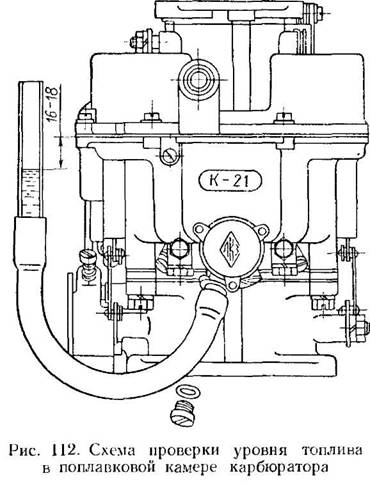 Проверка уровня топлива должна производиться при давлении, оговоренном в технических условиях. Для проверки не требуется каких-либо специальных стендов, а достаточно иметь лишь несложное приспособление. На некоторых типах карбюраторов (почти на всех последних моделях отечественных автомобилей, кроме Запорожца) для этой цели имеется либо смотровое окно, либо контрольное отверстие с резьбовой пробкой.На рис. 112 показана схема проверки уровня топлива в карбюраторе К-21 со стеклянной трубкой. Этот способ проверки приемлем для любого типа карбюратора. Достаточно иметь штуцер с резьбой для присоединения резинового шланга. Штуцер ввертывается в поплавковую камеру вместо сливной пробки. Следует помнить, что внутренний диаметр трубки должен быть не менее