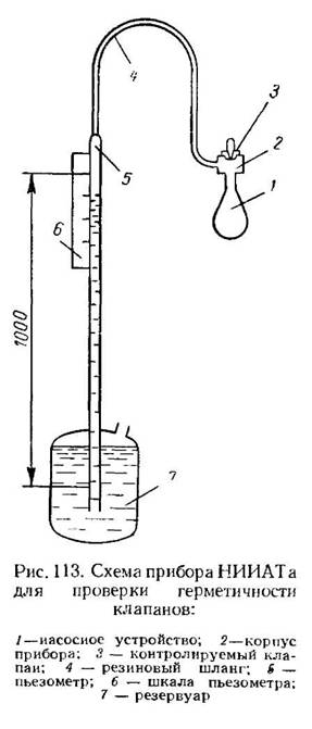 на приборе НИМАТа , схема которого представлена на рис. 113. Прибор состоит из вакуумного насоса (или обычной груши), гнезда для крепления проверяемого клапана, трубок, резервуара с водой и водяного пьезометра. Проверка производится следующим образом.