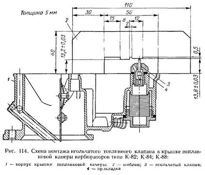 Для получения нормального уровня топлива необходимо правильно установить игольчатый клапан и поплавок.На рис. 114 показана схема установки клапана на крышке поплавковой камеры карбюраторов типа К-82, К-84 и К-88. Сферическая часть клапана должна находиться в пределах 13,2—13,8 мм от плоскости. Этот размер контролируется специальным шаблоном и подбирается путем установки под клапан прокладок различной толщины.