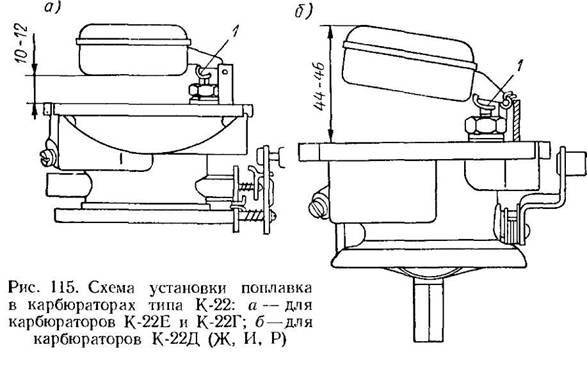 Регулировка уровня топлива в карбюраторах типа К-22 осуществляется подгибанием язычка 1 на рычаге поплавка. На карбюраторах К-22Г и К-22Е базовым размером является положение верхней плоскости поплавка от плоскости поплавковой камеры, а у карбюраторов К-22 (Ж, И, Р и Д), имеющих демпфирующую пружину, в качестве установочного размера применяется высота от нижней плоскости поплавка (наиболее отдаленной) до плоскости крышки карбюратора в момент начала касания язычка о стержень пружины клапана.