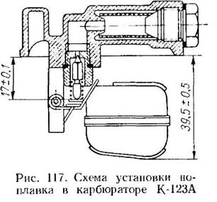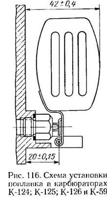 На рис. 116 показана схема установки поплавка карбюраторов унифицированного ряда Ленкарза (К-125, К-124, К-126), а также карбюратора К-59. Размер 20 ± 0,15 показывает положение крайнего витка пружины клапана относительно плоскости разъема, а размер 42 + 0,4 расстояние до нижней точки поплавка. На рис. 117 показана схема установки поплавка в карбюраторе К-123А.На карбюраторах типа К-105 при поднятом поплавке расстояние от верхней точки поплавка до плоскости разъема должно