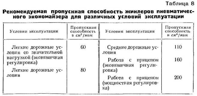 В табл. 8 приводятся рекомендуемые НИИАТом пропускные способности жиклеров пневматического экономайзера карбюратора типа К-82 для различных условий эксплуатации автомобиля.
